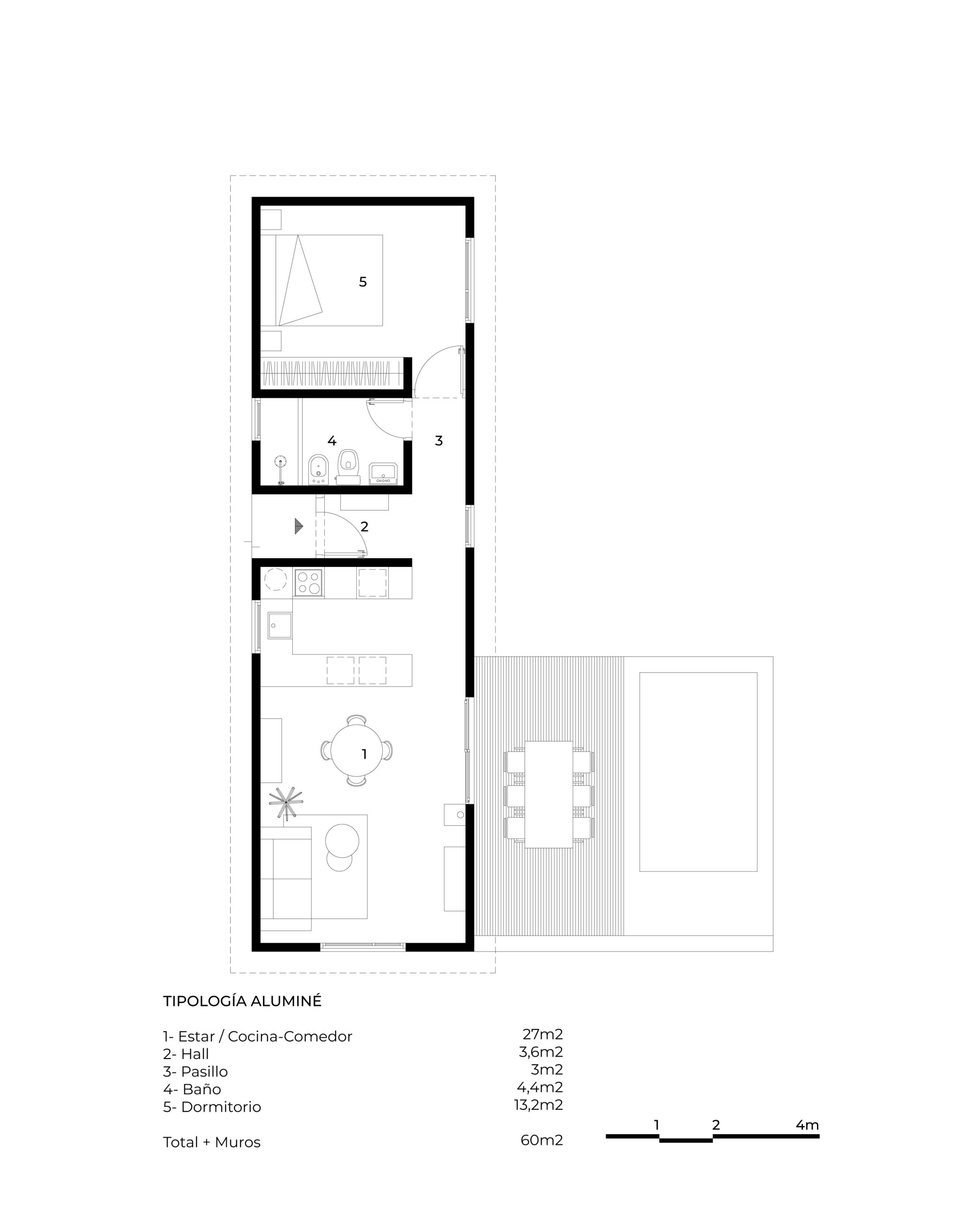 Pensada para espacios abiertos y aberturas direccionadas hacia las visuales. Para terreno con poco de frente se puede ubicar la tipología en la otra dirección.